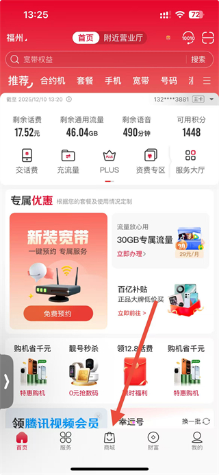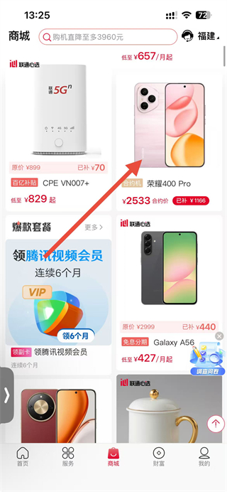 1、在中国联通主界面,点击底部导航栏的商城选项,进入商品浏览页面。