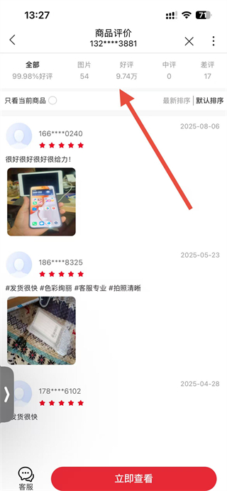 4、在商品评价界面,可查看全部评价,也能按图片、好评等分类筛选,了解该商品的用户反馈信息。