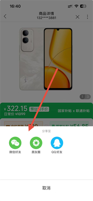 4、在分享菜单中,选择微信好友或朋友圈选项,即可将该商品分享至微信平台。
