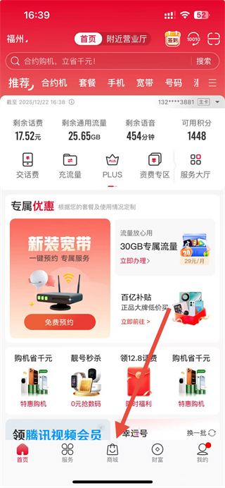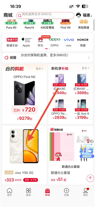 1、进入中国联通应用首页,点击底部商城选项,进入对应页面。