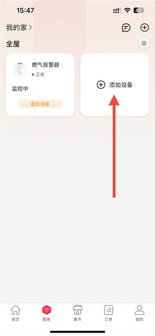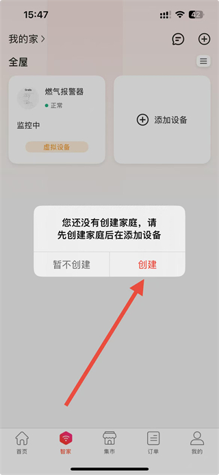 2、在智家页面,点击添加设备选项,触发创建家庭的提示弹窗。