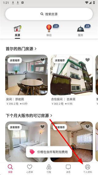 1、打开爱彼迎APP后,点击首页底部个人资料选项,进入个人资料界面。