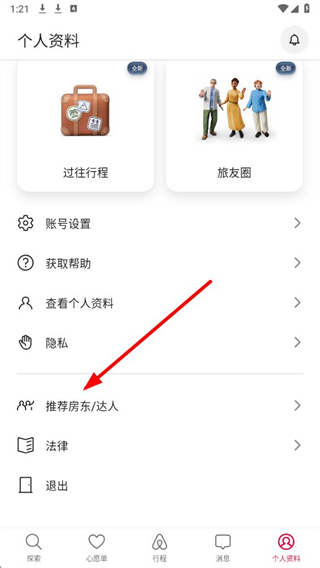 2、在个人资料界面中,找到推荐房东达人选项并点击,进入推荐相关的操作页面。