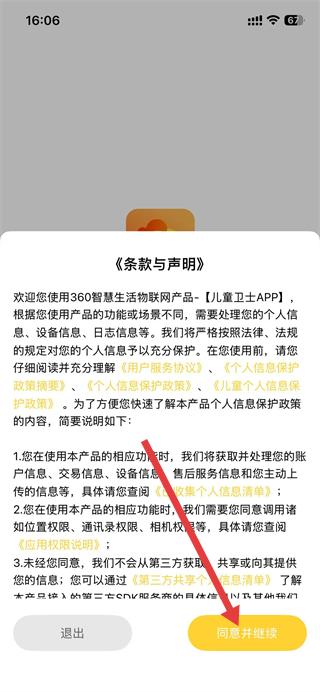 1、打开360儿童卫士,在弹窗中点击同意并继续。