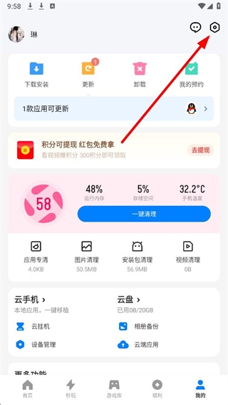 3、点击底部我的选项,进入个人页面,看到一键清理按钮,点击该按钮,可对运行内存、存储空间等进行清理,也能在更多功能里使用游戏加速、手机降温等功能。