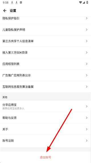 3、在设置页面,下滑底部找到退出账号选项并点击,此时会弹出确认退出的提示弹窗。