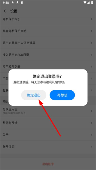4、在弹窗中点击确定退出按钮,即可完成应用宝的账号退出登录操作。