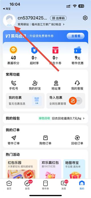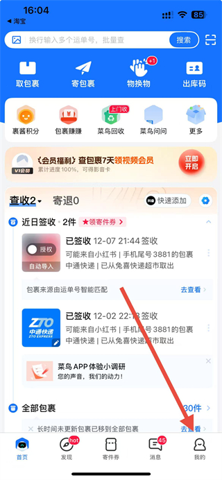 1、在菜鸟app界面底部,找到并点击我的选项,进入对应页面。