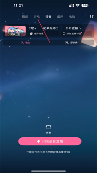 1、启动哔哩哔哩直播姬,点击顶部的语音标签,进入语音直播的准备页面。