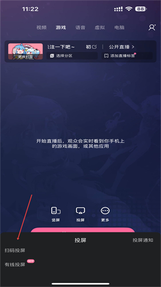 2、在游戏的页面下,点击下方投屏的功能按钮。