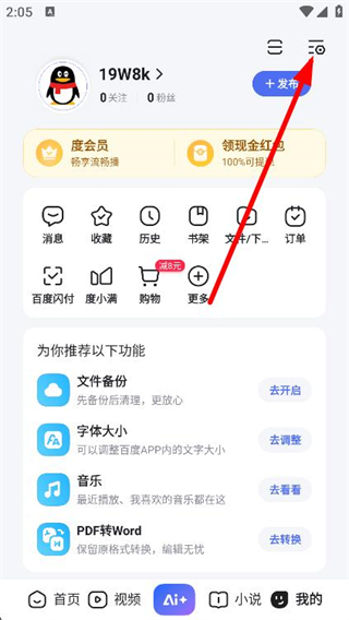 1、打开百度应用,点击右上角的功能菜单按钮。