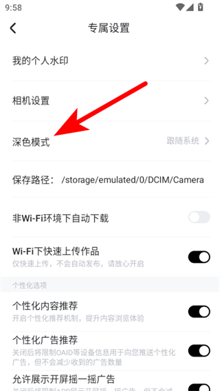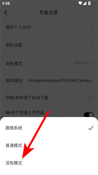4、在专属设置页面,点击深色模式选项,弹出模式选择菜单。