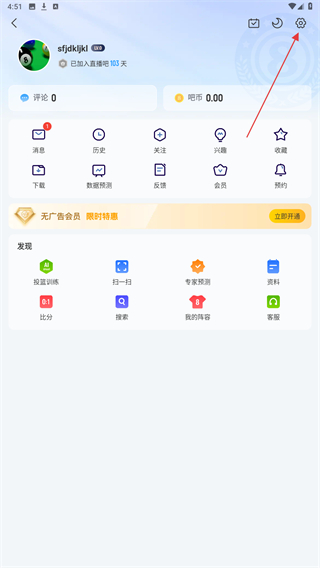 2、在个人中心的界面内,点击右上角设置的功能按钮。
