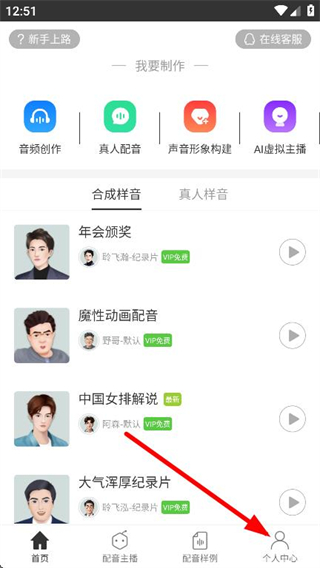 1、打开讯飞配音APP,点击页面底部导航栏的个人中心。