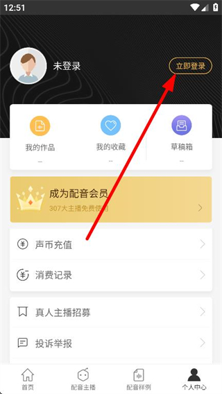 2、在个人中心页面,点击立即登录按钮,进入登录页面。