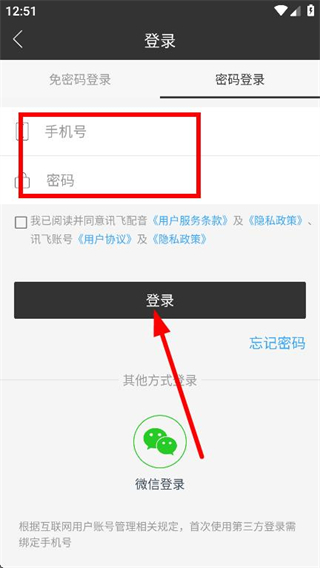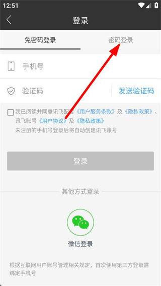 3、在登录页面,选择密码登录选项,填写对应的手机号。