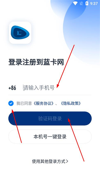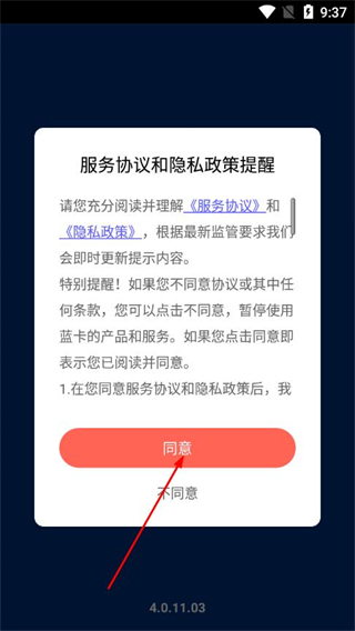 1、打开蓝卡网,在服务协议和隐私政策提醒弹窗中点击同意。