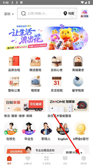 1、进入自如应用,点击首页底部我的家选项,进入对应页面。