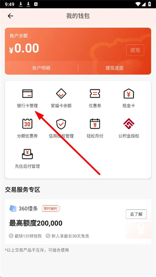3、在我的钱包页面,点击银行卡管理选项,进入银行卡管理页面。