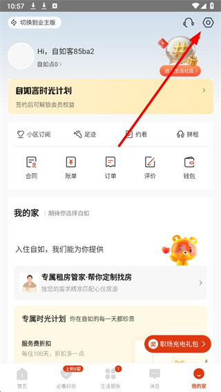 1、打开自如app,在我的家界面,点击右上角的设置图标,进入设置页面。