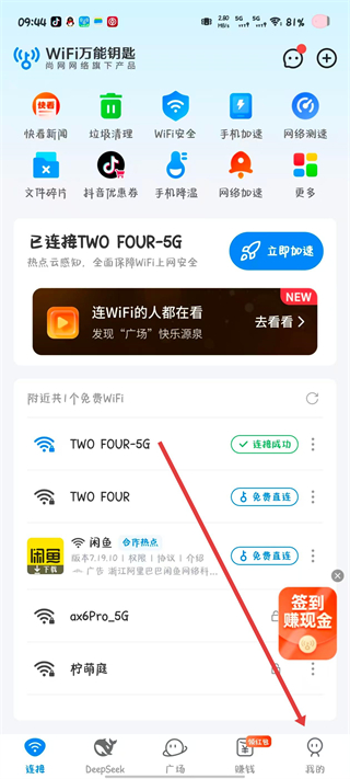 1、打开WiFi万能钥匙,点击底部导航栏最右侧我的选项,进入个人中心页面。