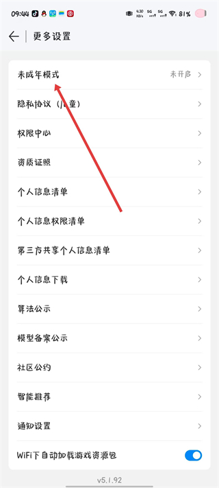 3、在更多设置列表中选择未成年模式选项,进入对应的模式设置页面。