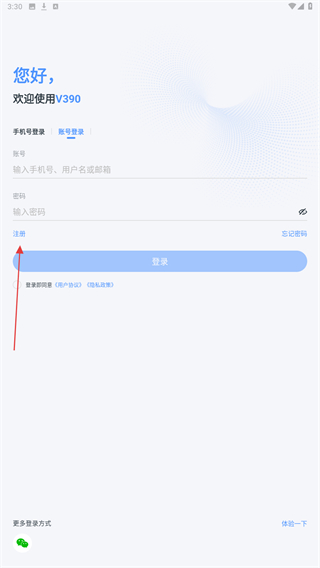 1、启动安格华v390摄像头APP,进入时点击账号登录。