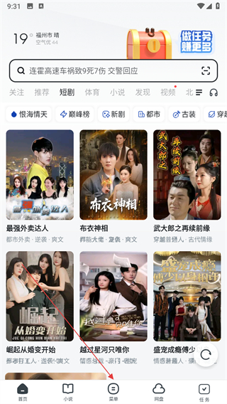 1、打开UC浏览器极速版,进入首页后点击底部中间的菜单按钮,展开功能选项面板。