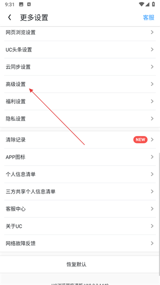 3、在设置页面里,找到高级设置选项并点击,跳转至高级设置的详情界面。