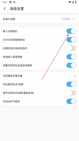 4、在高级设置界面中,找到输入法增强栏对应的开关,点击开关将其开启。
