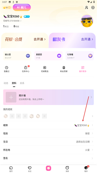 3、在个人资料页面中,点击当前昵称区域,进入修改昵称的操作页面。