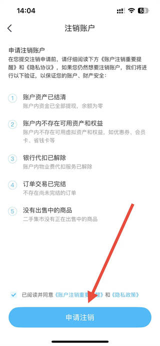 4、确认账户满足资产结清、无未完成订单等注销条件后,勾选协议并点击申请注销,完成账户注销操作。