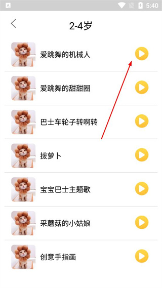 3、进入2-4岁分类页面后,看到列表中的爱跳舞的机械人,找到其右侧的播放按钮并点击。