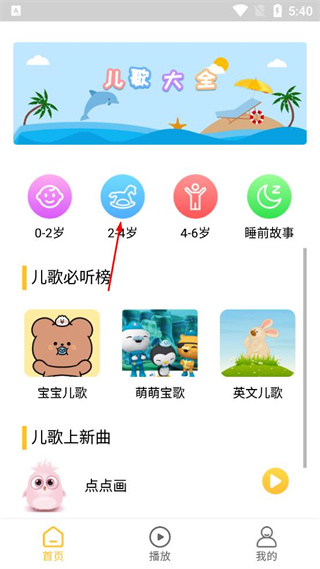 2、进入软件主界面后,看到儿歌大全下方的分类选项,找到2-4岁这个分类图标并点击。