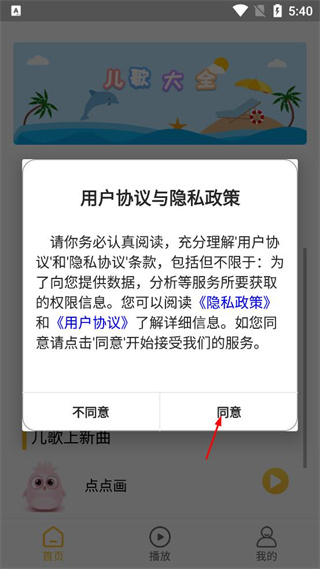 1、打开该儿歌软件,看到弹出的用户协议与隐私政策窗口,找到窗口中的同意按钮并点击。