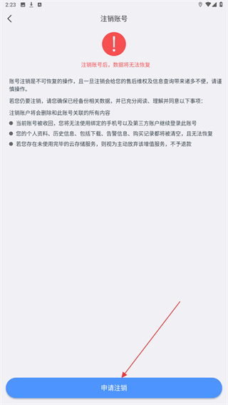 4、进入注销账号页面内,了解后点击申请注销即可。