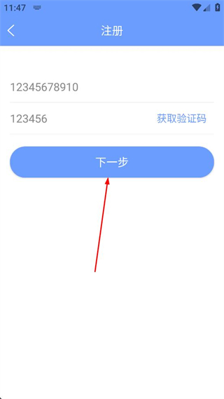4、填写收到的验证码后,点击界面中的下一步按钮,继续完成注册流程。