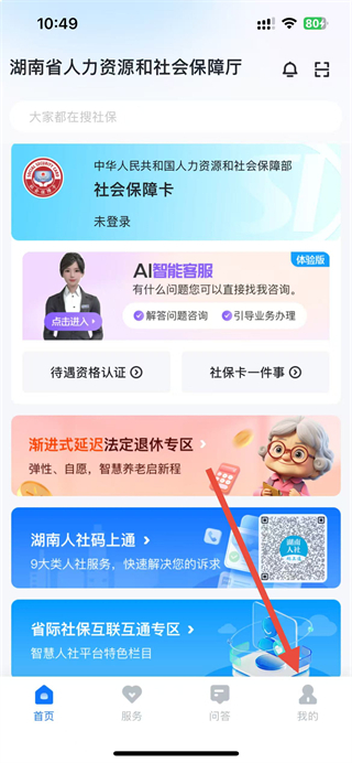 1、打开湖南智慧人社APP后,在界面底部找到我的选项并点击,进入登录界面。