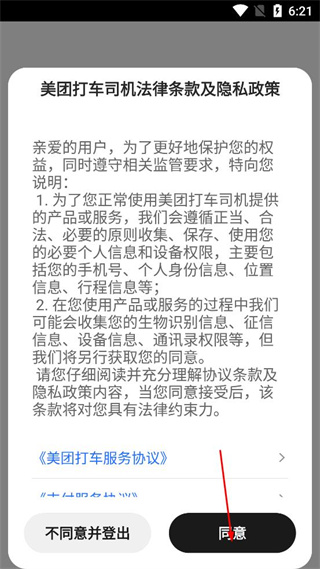1、打开美团打车司机,阅读法律条款及隐私政策内容,点击页面中的同意按钮。