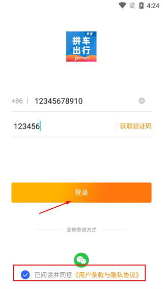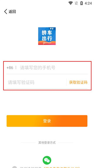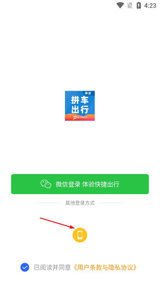 1、打开拼车出行页面,找到其他登录方式下方的手机图标,点击该图标进入手机号登录页面。