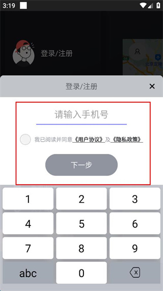4、在输入框中填写手机号码,勾选相关协议选项,准备点击下一步按钮继续。