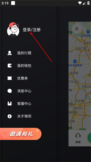 2、在主页面左上角,点击头像图标,展开侧边栏菜单,找到登录注册选项。