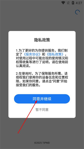 1、打开狄普医生app,在弹出的隐私政策弹窗中点击同意并继续。