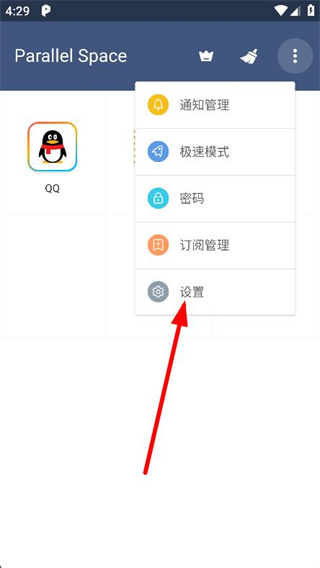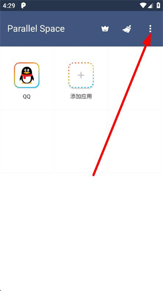 1、打开平行空间应用,点击三点菜单按钮,展开功能选项列表。