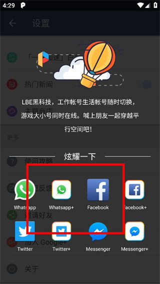 3.几乎所有的安卓应用都可以在LBE平行空间内登陆第二帐号,同时接收两个帐号的信息,不同的账户数据互不影响。