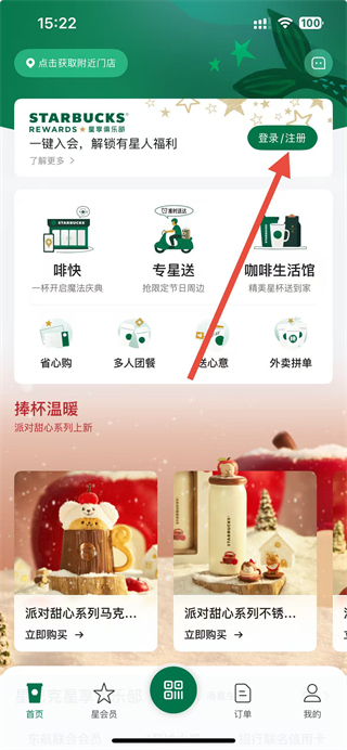 1、打开星巴克app,在首页找到登录注册按钮并点击,进入登录界面。