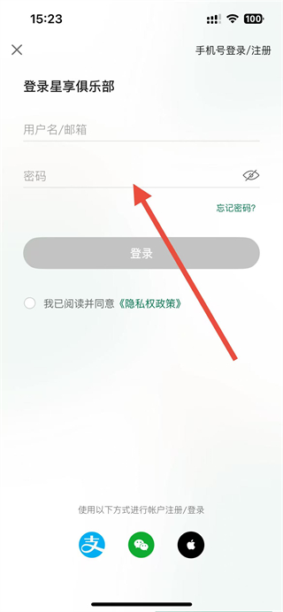 3、在登录页面依次输入账号和密码,勾选同意隐私权政策后,点击登录按钮,即可完成登录。