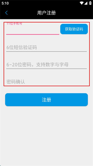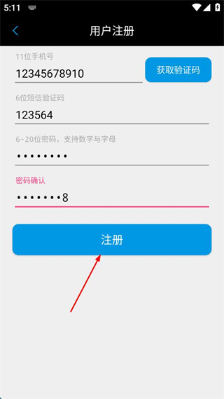 2、在用户注册界面,依次填写11位手机号,获取并填写6位短信验证码。