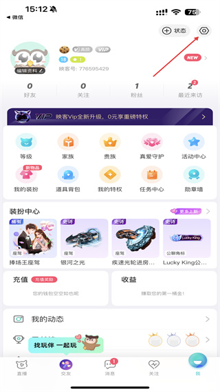 2、在个人中心页面中,点击右上角设置的功能按钮,进入设置操作界面。