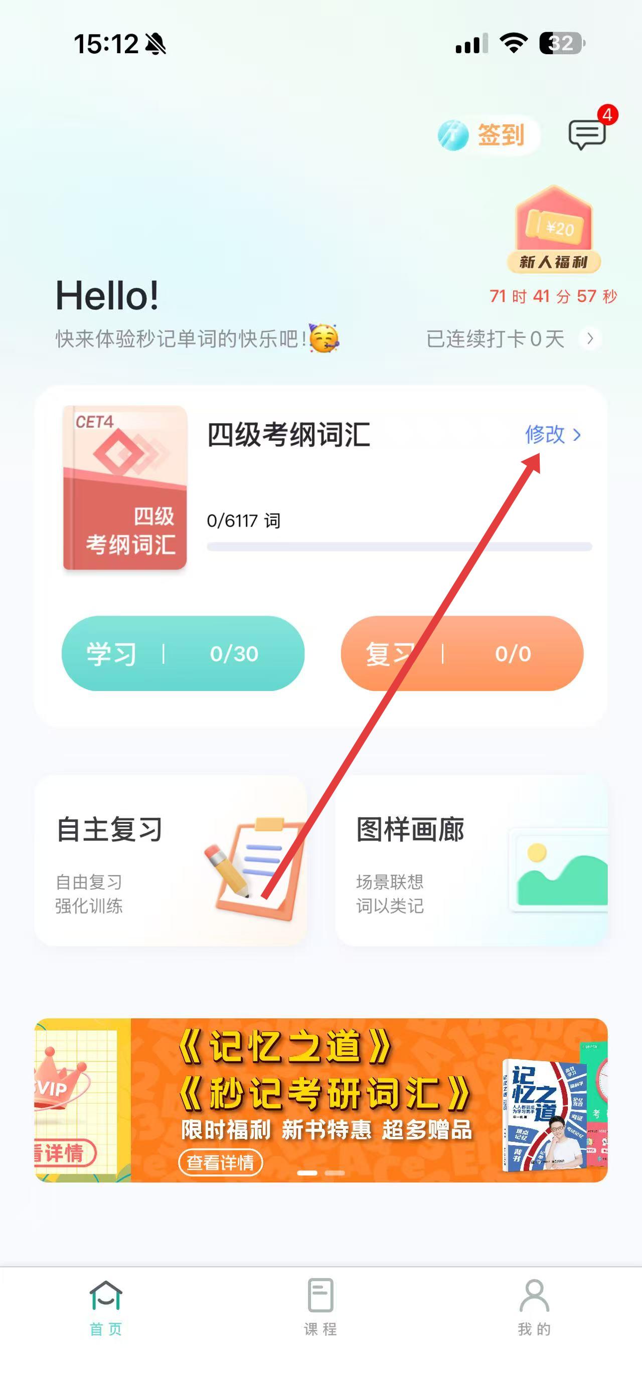 1、打开图样单词APP,在首页点击四级考纲词汇右侧的修改按钮。